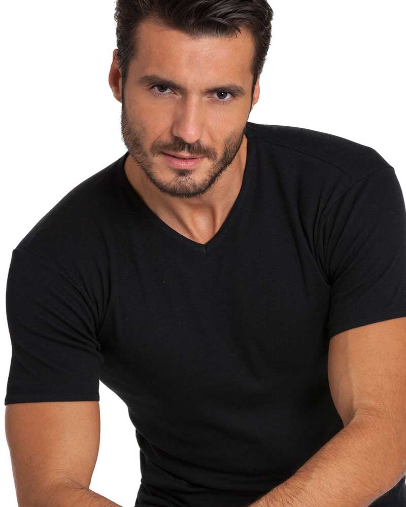 Maglie da uomo scollo a V in puro cotone leggermente aderenti, non elasticizzate, rifinite con bordino sulla manica.