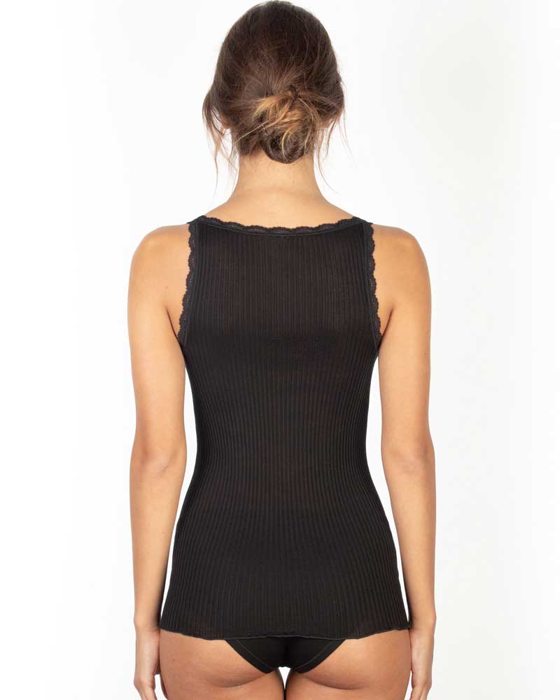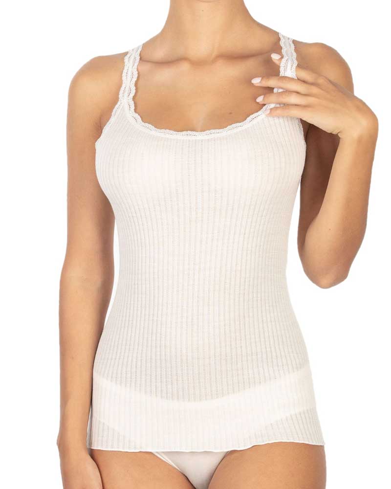 Canotta da donna in micro lana su tessuto a costina con spallina sottile, scollata in tondo sul davanti e più alta dietro sul dorso, rifinita con bordino in pizzo su decoltè e spalline.