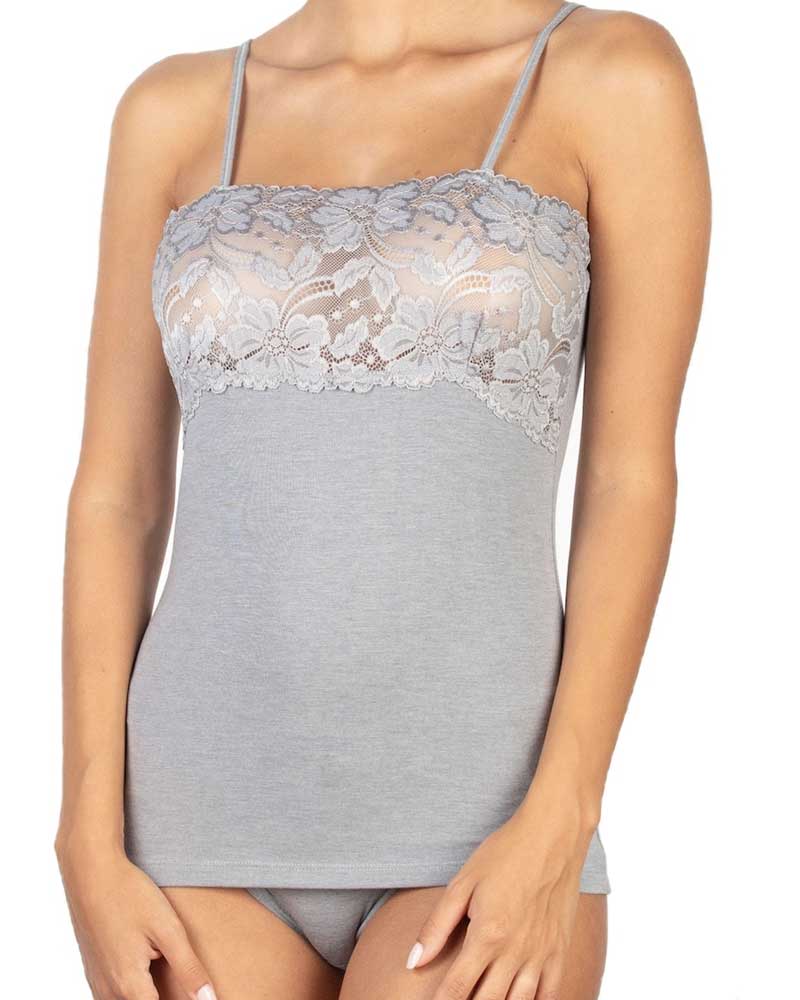 Canotta da donna in morbido micromodal, con spalla stretta e ampia fascia sul seno di pizzo in tinta elasticizzato.