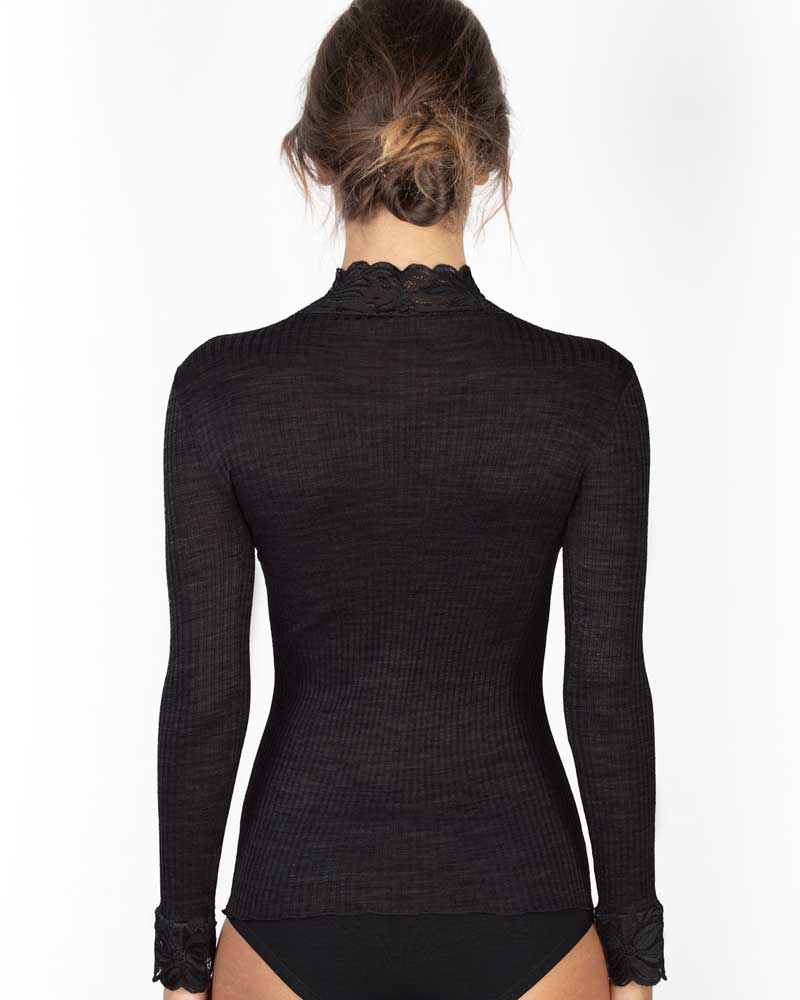 Lupetto a manica lunga in micro lana (Lana e microfibra) su tessuto a costina rifiniti con morbido pizzo in tinta sul collo e sui polsi.