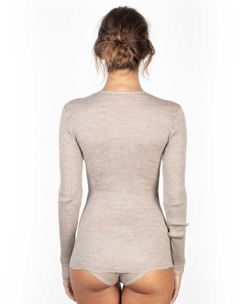 Maglia da donna in micro lana su tessuto a costina con manica lunga, scollata in tondo sul davanti, rifinita con bordino in pizzo su decoltè e sulle maniche.