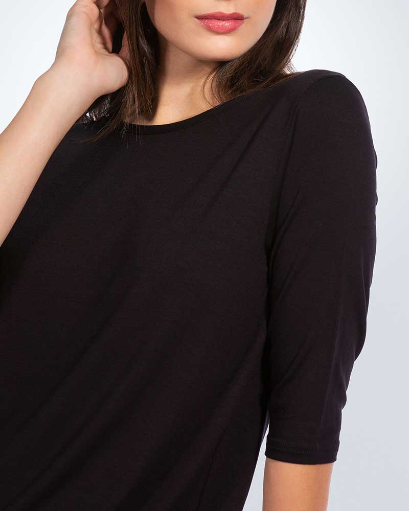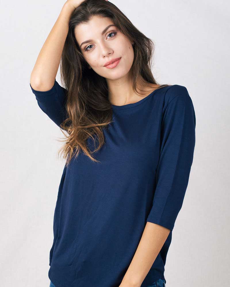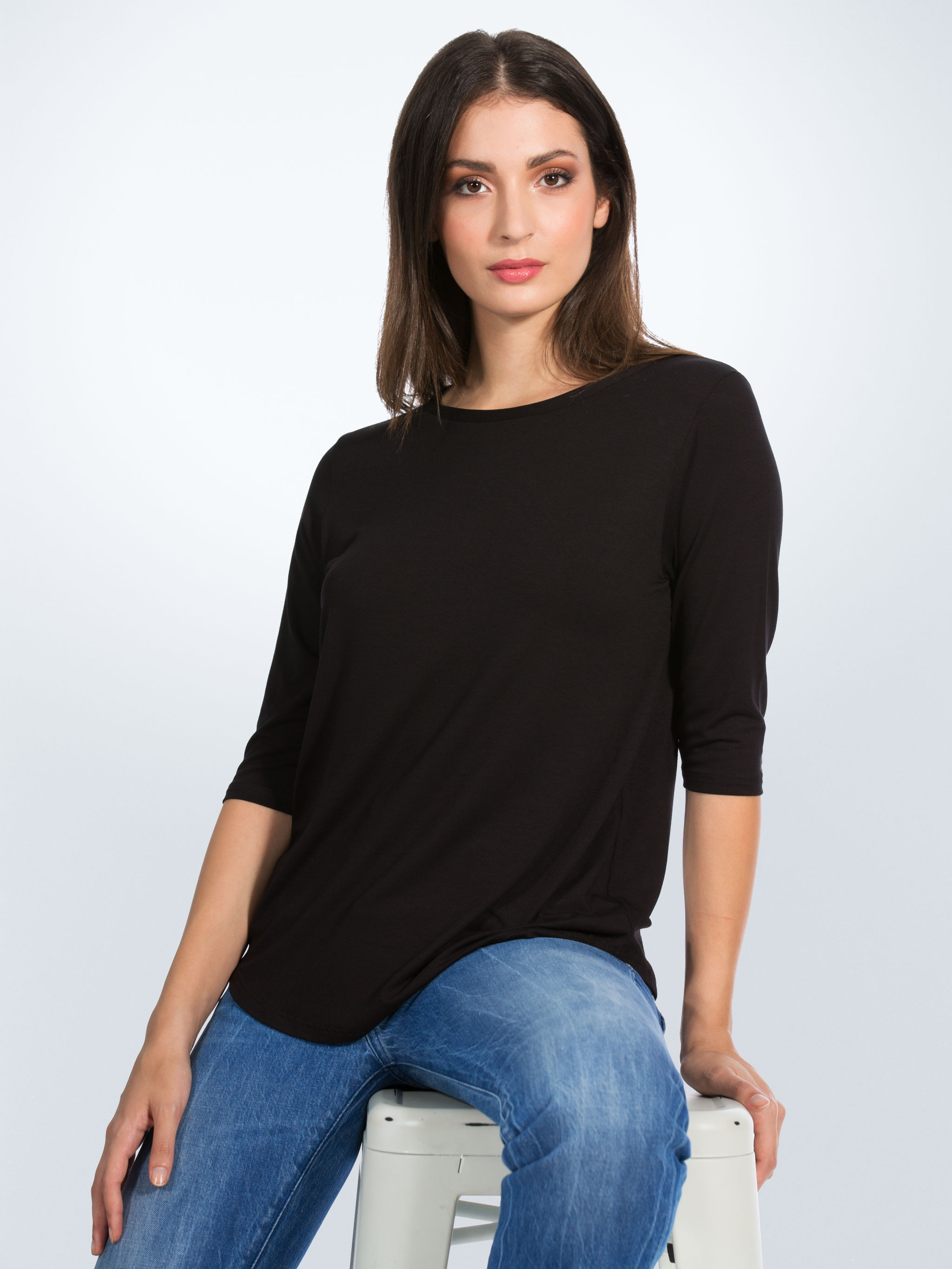 Maglia da donna con manica a tre quarti, scollo tondo liscio in morbida viscosa.