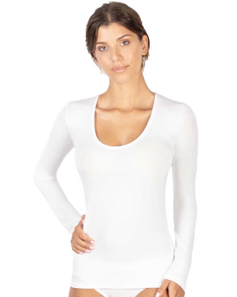 Maglia da donna manica lunga con scollo tondo liscio in morbido micromodal, adatte anche ad uso esterno o sottogiacca.