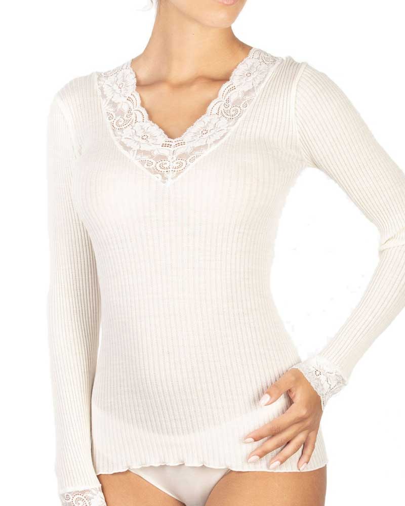 Maglia manica lunga in micro lana su tessuto a costina rifinita con pizzo in tinta sulla scollatura a V e sui polsi.