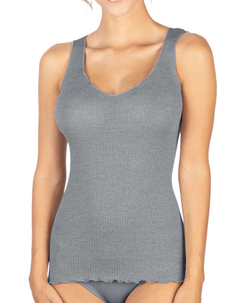 Canotta donna con spallina larga in lana e seta su tessuto a costina.
