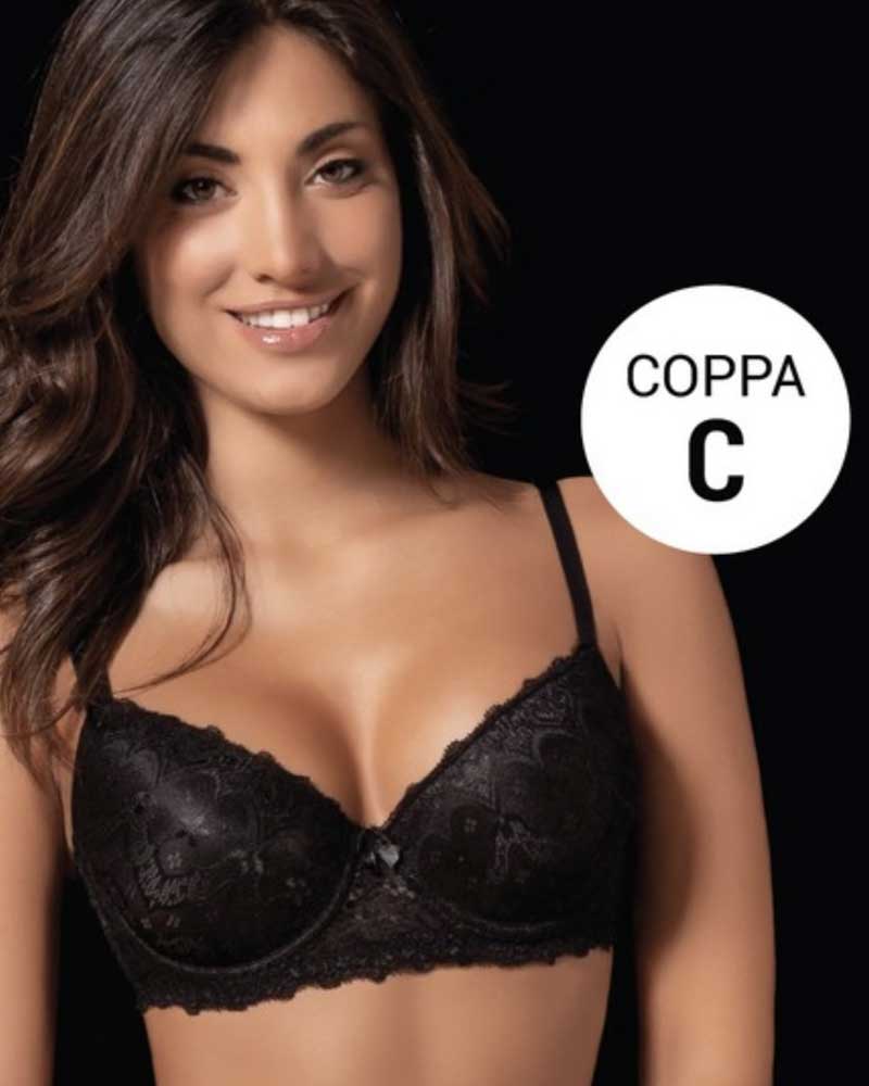 Reggiseno balconcino coppa C leggermente imbottito in pizzo con ferretto e interno coppa foderato in cotone.