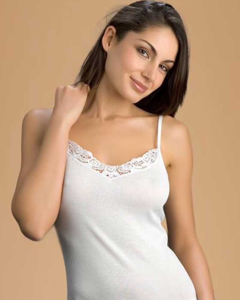Canotta da donna calibrata maxi in puro cotone makò spallina stretta con inserto in pregiato pizzo macramè di cotone.