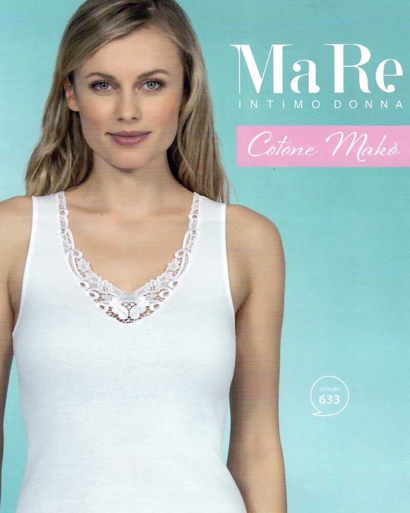 Canotta da donna calibrata maxi in puro cotone makò con spalla larga con inserto in pregiato pizzo macramè di cotone.