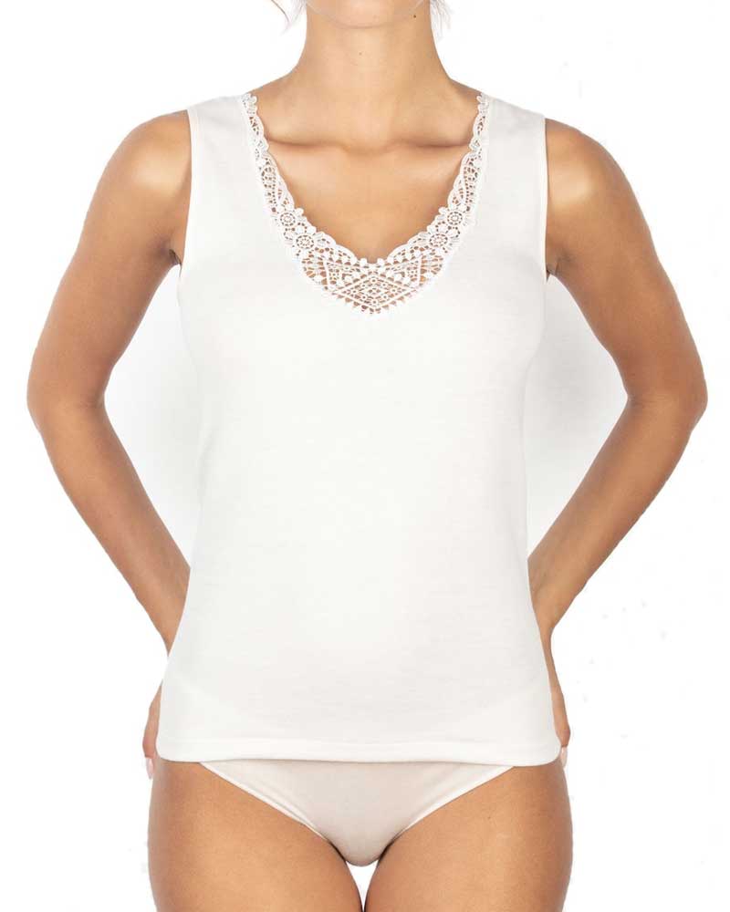 Canotta donna calibrata taglia maxi in morbida lana e cotone ( misto lana all'esterno e puro cotone all'interno) con spalla larga rifinita con pizzo macramè sulla scollatura.