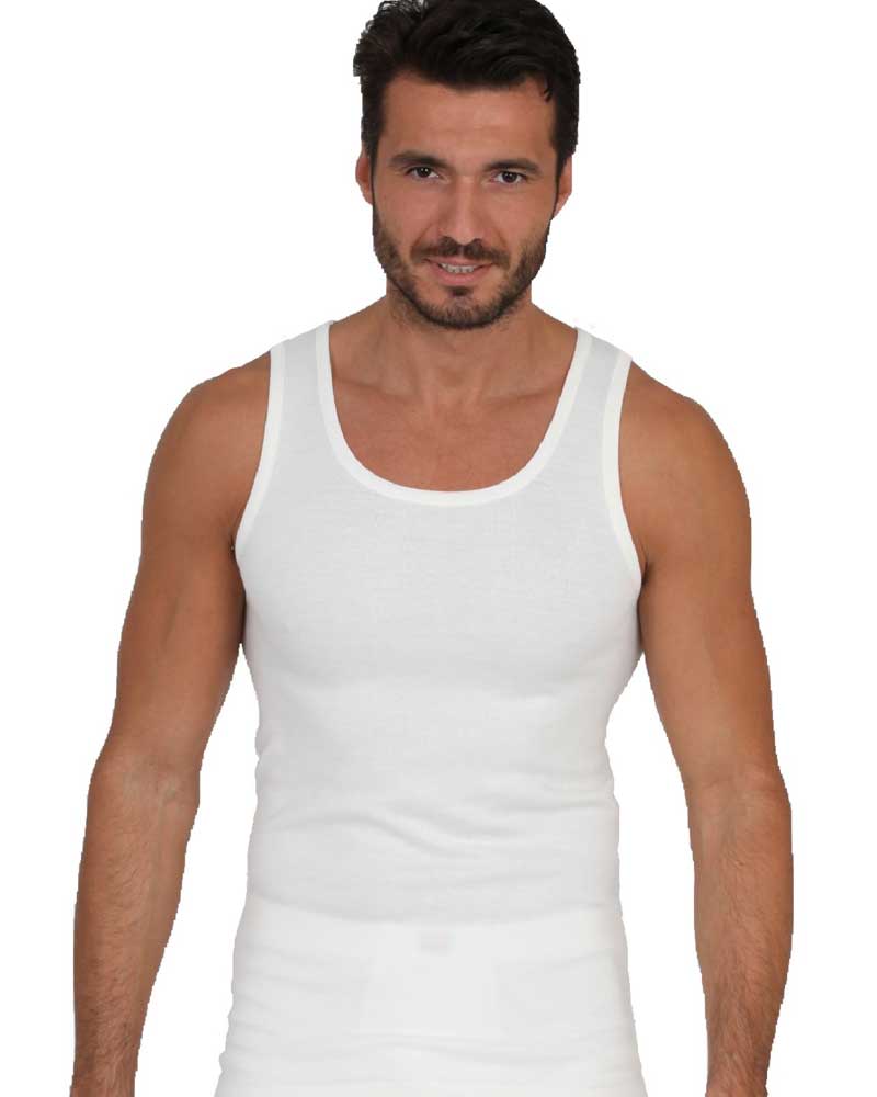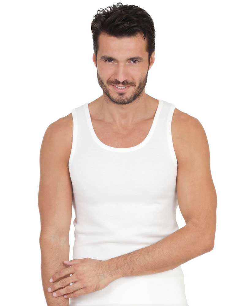 Canotta da uomo in morbida lana e cotone (interno puro cotone, esterno misto lana) con splalla larga.