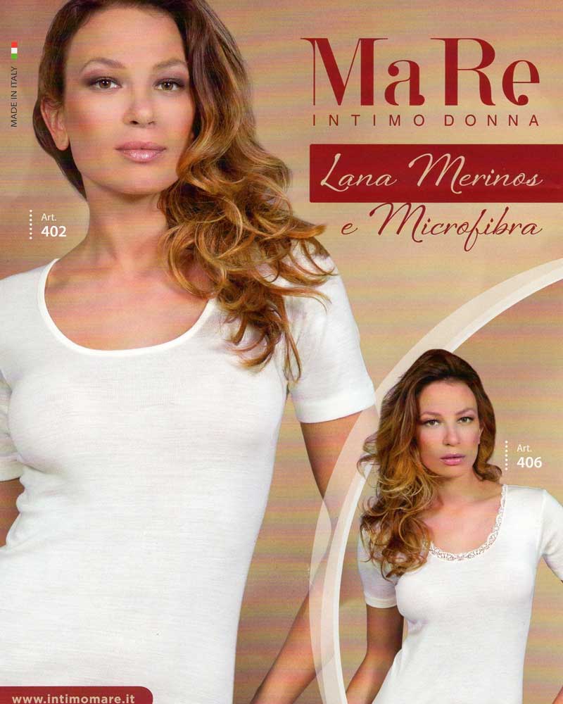 Maglia da donna in morbida microlana con manica corta, rifinita con bordino liscio sulla scollatura.