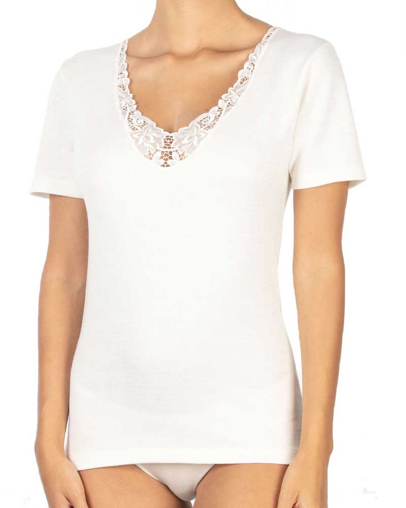 Maglia da donna in morbida lana e cotone ( misto lana all'esterno e puro cotone all'interno) con manica corta e scollatura rifinita con pizzo macramè.
