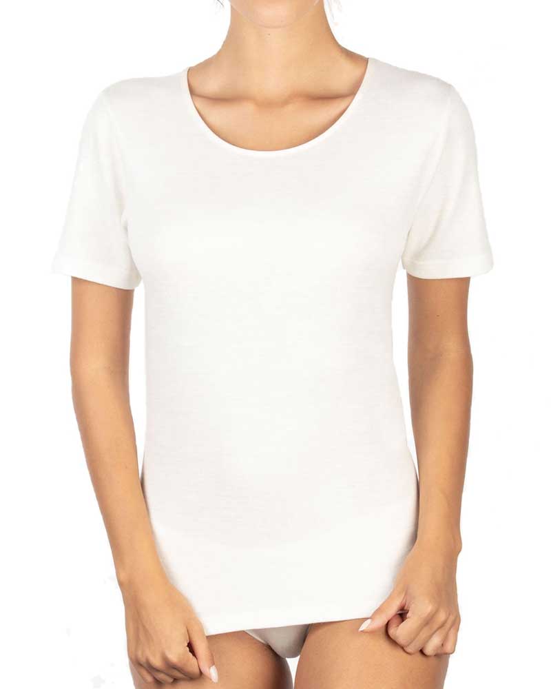 Maglia da donna in morbida lana e cotone ( misto lana all'esterno e puro cotone all'interno) con manica corta e scollatura liscia semplice.