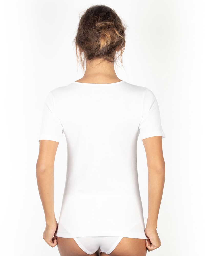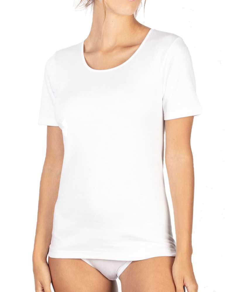 Maglie donna con manica corta in puro cotone felpato interlook rifinite con scollo tondo liscio semplice.