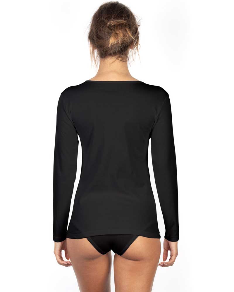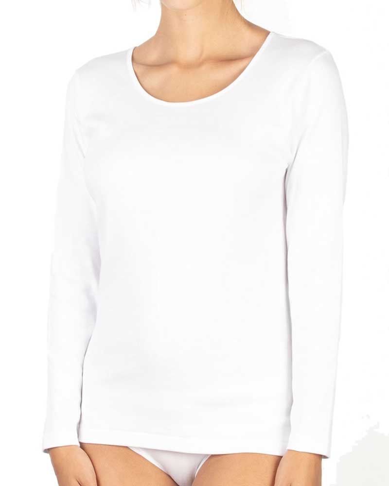 Maglie donna con manica lunga in puro cotone felpato interlook rifinite con scollo tondo liscio semplice.