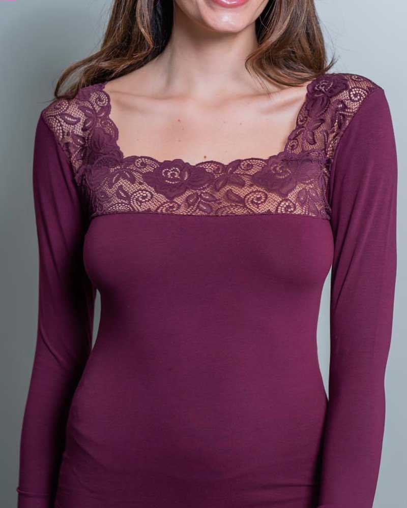 Maglia da donna manica lunga con scollo quadrato su cotone elasticizzato.