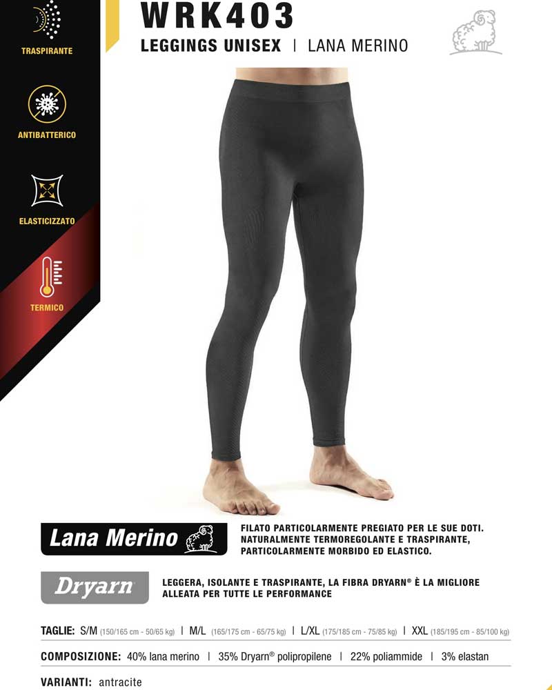 Leggings termico unisex gamba lunga in lana merino e microfibra Dryarn.